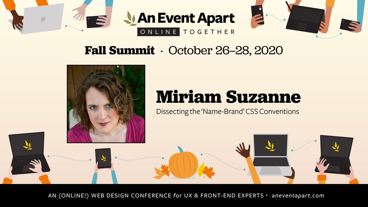 Excited about this aneventapart Fall Summit lineup on Oct 26-28. Hope you'll join us! You can also save $100 on any multi-day pass with promo code: AEAMIRI See the agenda and register now: aneventapart.com/event/online-1020